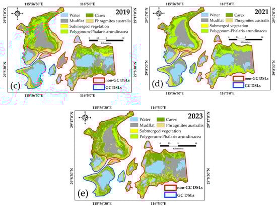 We selected four representative DSLs and assessed their area coverage before and after the 2020 extreme flood and the 2022 extreme drought. In Banghu Lake, emergent and hygrophilous wetland vegetation covered 69.57% of the lake area in 2019, declined to 63.88% after the 2020 flood, and then increased to 72.50% in 2023 following the 2022 drought. In contrast, GC DSLs, including Dahuchi Lake, Shahu Lake, and Changhuchi Lake, showed different trends. After the 2020 flood, emergent and hygrophilous cover in these lakes increased by 8.93%, 5.16%, and 30.14%, respectively. Following the 2022 drought, Dahuchi Lake and Shahu Lake continued to gain vegetation cover, whereas Changhuchi Lake’s cover declined to 34.32%, remaining nonetheless above its pre-event level. Variations in vegetation response among GC DSLs may result from differences in hydraulic regulation strategies, local topography, and vegetation characteristics across lakes [57].