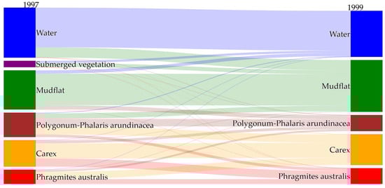 Using multi-source satellite imagery at 10/30 m resolution, a Random Forest classifier (OA > 85%, Kappa > 0.82) was applied to map substrate changes in ecologically sensitive zones during the same seasons one year before and after the 1998 flood, 2020 flood, and 2022 drought (Figure 6). Habitat transition matrices (Figure 7 and Figure 8) were then used to quantify conversion pathways among habitat types, thereby revealing vegetation succession patterns driven by extreme hydrological events.