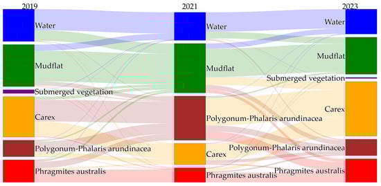 The 2020 flood produced a similar succession pattern: mudflats expanded from 67.88 km2 to 79.87 km2, and submerged vegetation fell from 6.04 km2 to near zero—most of it converting to mudflats, with some areas invaded by Polygonum-Phalaris arundinacea. Carex spp. losses (≈35.09 km2) and Phragmites australis losses (≈10.30 km2) were also predominantly converted into Polygonum-Phalaris arundinacea.
