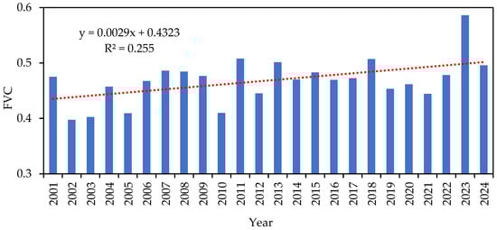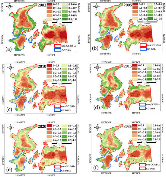 Spatial distribution of the annual average FVC of typical-year DSLs. (a) 2001, (b) 2005, (c) 2010, (d) 2015, (e) 2020, (f) 2024.