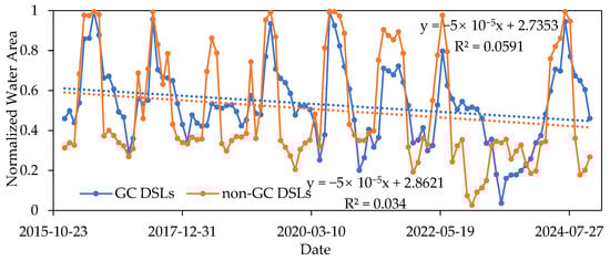 Comparison of normalized water area between GC DSLs and non-GC DSLs from 2016 to 2024.