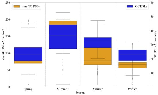 All DSLs displayed pronounced seasonality (Figure 12). GC DSLs had a slightly larger water area in autumn (September–November, 29.59 km2) than in spring (March–May, 23.77 km2), with the maximum area in summer (June–August, 34.98 km2) and the minimum in winter (December–February, 22.03 km2). Non-GC DSLs followed a similar pattern, with the highest and lowest areas in summer (159.52 km2) and winter (58.92 km2), respectively, but the autumn area (58.92 km2) was lower than spring (99.70 km2).