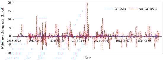 From 2016 to 2024, non-GC DSLs exhibited a mean area increase rate of 1.73 km2/d and a mean area decrease rate of 1.72 km2/d. Their maximum increase and decrease rates were 20.01 km2/d (on 8 June 2020, during the extreme flood) and 8.23 km2/d, with coefficients of variation of 1.31 for increases and 1.08 for decreases. In contrast, GC DSLs showed a mean area increase rate of 0.44 km2/d and a mean area decrease rate of 0.35 km2/d; their maximum increase and decrease rates were 4.29 km2/d and 2.76 km2/d, respectively, with coefficients of variation of 1.24 for increases and 1.15 for decreases. Thus, both the long-term mean rates and the extreme rates of area change in GC DSLs were substantially lower than those in non-GC DSLs (Figure 13).