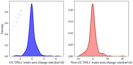 Density distribution of the water area change rate of GC DSLs and non-GC DSLs from 2016 to 2024.