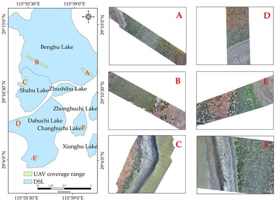 Distribution of vegetation strips in DSLs captured by UAV in December 2024. (A) Southeastern Benghu Lake, (B) Southwestern Banghu Lake, (C) Western Shahu Lake, (D) Western Dahuchi Lake, (E) Southern Dahuchi Lake, (F) Eastern Changhchi Lake.