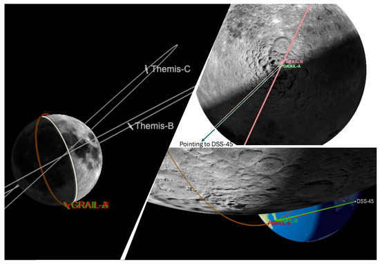 Left: GRAIL RO orbit geometry viewing from the DSS-45 antenna (in the Canberra DSN complex) to the GRAIL-pointing direction. The upper and bottom-right show the RO signal path (GRAIL-to-DSS 45) over the Moon’s South Pole region.