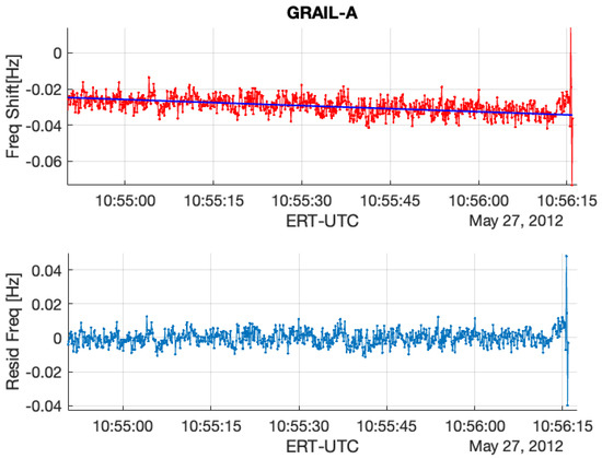 (Upper): GRAIL RO residual frequency (GRAIL-A/DSS45 2012DOY148 (UTC10:56)) with the removal of Doppler and Earth’s atmosphere and ionosphere effects. (Bottom): the final residual frequency with a first-order polynomial fit to remove the background trend resulting from the uncertainties of calibrations including orbit, atmosphere, and ionosphere.