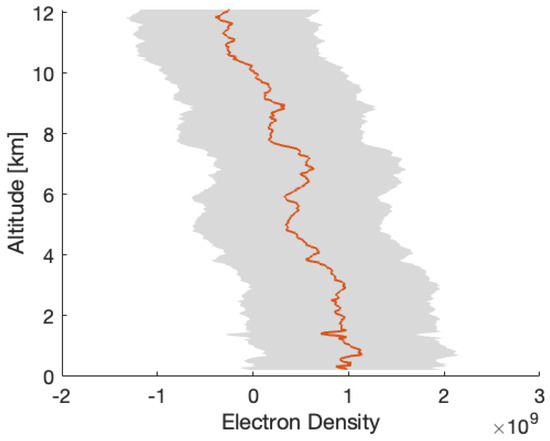 After removing the background trend from the two residual frequency time series displayed in Figure 3 and Figure 4, we can calculate the electron density using the method outlined in Section 2 (see (2) and (3)), utilizing the RO geometry determined by GRAIL orbits (https://naif.jpl.nasa.gov/pub/naif/pds/data/grail-l-spice-6-v1.0/grlsp_1000/aareadme.htm, accessed on 28 May 2025). Figure 5 and Figure 6 illustrate the electron density profiles retrieved from the selected residual frequency time series. The shaded area in these figures indicates the uncertainties in the electron density, which range approximately from 4.3– m−3 (denoted as ). The uncertainty () is calculated using Equation (6) in Section 3, with a standard deviation of the residual frequency () of 3.2 mHz and a spacecraft velocity (V) of 1.56 km/s. Figure 7 shows the electron density profile retrieved from South Pole terminator RO data at 05:38 UTC on 1 April 2012.