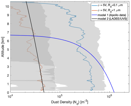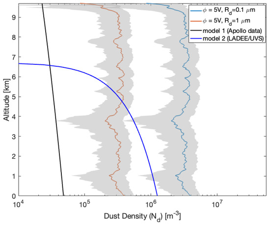 Dust density profiles estimated using the GRAIL RO-derived electron density profile (Figure 7) with the charging potential 5 V and two dust particle sizes ( μm and μm) shown as blue and red profiles, respectively. The shaded area shows the dust density uncertainty.
