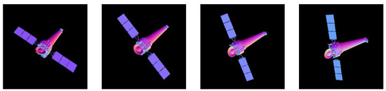 This study utilized 3D models of eight NASA spacecraft obtained from official NASA repositories: Aura (Earth Observing System spacecraft built by Northrop Grumman, Redondo Beach, CA, USA); Chandra X-ray Observatory (space telescope built by Northrop Grumman, Redondo Beach, CA, USA, operated by Smithsonian Astrophysical Observatory, Cambridge, MA, USA); Deep Space 1 (technology demonstrator spacecraft built by Jet Propulsion Laboratory, Pasadena, CA, USA); ICESat-2 (Ice, Cloud and land Elevation Satellite-2 with ATLAS instrument developed by NASA Goddard Space Flight Center, Greenbelt, MD, USA; spacecraft bus by Northrop Grumman, Gilbert, AZ, USA); Jason-1 (oceanography satellite built by Thales Alenia Space, Cannes, France for CNES, and Jet Propulsion Laboratory, Pasadena, CA, USA for NASA); Juno (Jupiter orbiter built by Lockheed Martin Space, Denver, CO, USA, operated by Jet Propulsion Laboratory, Pasadena, CA, USA); MESSENGER (Mercury orbiter built by Johns Hopkins University Applied Physics Laboratory, Laurel, MD, USA); TOPEX/Poseidon (oceanography satellite built by Fairchild Industries, Germantown, MD, USA with NASA instruments by Jet Propulsion Laboratory, Pasadena, CA, USA). All digital models were sourced from NASA’s publicly available 3D model repositories [36], covering diverse configurations including satellites, orbital transfer vehicles, and exploration probes. Each model is converted into watertight meshes with triangle counts ranging from 50 K to 200 K faces. Each model has 10 sequences, where each sequence contained 150 frames rendered with the algorithm in Section 2.4. Four examples of the simulated normal maps of various spacecraft are illustrated in Figure 3. For pose trajectory simulation, the initial transformation is randomly sampled from 6D pose space and the incremental Euler angle and translation along each axis are randomly increased within and [−50 cm, 50 cm] for subsequent frames, generating challenging trajectories with sudden maneuvers and introducing discontinuous jumps in angular and positional velocity.
