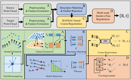 Pipeline of the proposed method. Letters denote key stages: (A) Preprocessing and feature extraction, (B) Descriptor matching and outlier rejection, (C) RANSAC-based coarse registration, (D) Multi-scale iterative fine registration. Arrows indicate data flow direction between processing stages.