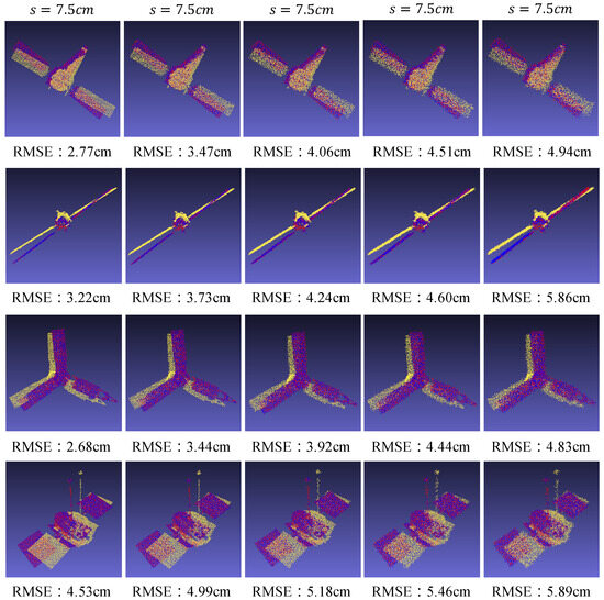 All experiments are carried out on an Intel i9-9900K CPU at 3.7 GHZ. We use C++ and PCL library to implement the proposed algorithm. The voxel size s is set to 2.5, 5.0, 7.5, and 10 cm, respectively, for experiments on efficiency and accuracy. All spacecraft models are scaled into a cube with 3 m edge length and placed at 3 m to 10 m in front of the virtual ToF camera. The intrinsic parameters of principal point for ToF imaging are the center of the image with a resolution of , and the focal length is set to 525.