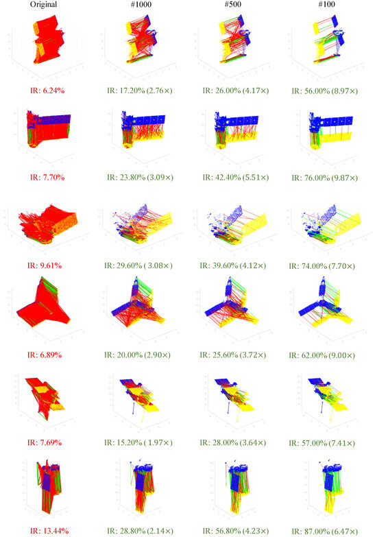 We conducted experiments to evaluate the limitations of the coarse-only method using FPFH features and demonstrate the effectiveness of our proposed efficient outlier rejection strategy. The results, as shown in Figure 5, highlight significant improvements in inlier ratio (IR) after applying our method, particularly in scenarios with repetitive structures (e.g., solar panels) that inherently generate high outlier ratios. Several conclusions can be reached: Outlier Rejection in Repetitive Structures: In the second row, the solar panel region initially exhibited a large number of false matches due to its repetitive geometry. Our outlier rejection method successfully eliminated nearly all outliers, improving the IR by nearly 10× (e.g., from 7.70% to 76.00% in the fourth column). Robustness to Extreme Outliers: The first five rows show initial IRs below 10%, validating our method’s capability to handle scenarios with severe outlier contamination. Post-rejection, the IRs consistently exceeded 50%, with the highest reaching 87% (sixth row, fourth column). Impact of Survival Matches: Columns 2–4 illustrate IRs under varying survival match counts (1000, 500, 100). As the number of survival matches decreases, the IR progressively increases, demonstrating that our method efficiently prioritizes high-quality correspondences. For instance, in the sixth row, reducing survival matches from 1000 to 100 improved the IR from 13.44% to 87.00% (6.47× enhancement). In summary, the substantial IR improvements directly address the computational inefficiency of RANSAC in high-outlier regimes. By reducing outlier proportions, our method minimizes the required RANSAC iterations, thereby enhancing both computational efficiency and registration accuracy. These results underscore the practicality of our approach for real-world applications involving complex geometries and aggressive motion.