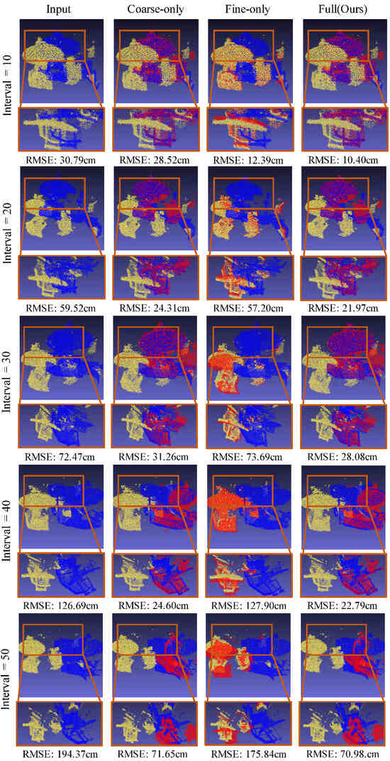 To further validate the necessity and effectiveness of our proposed coarse-to-fine two-stage registration framework, we conduct ablation experiments under challenging scenarios with large inter-frame motions. Specifically, the source and target point clouds are sampled from sequential frames with increasing temporal intervals (10, 20, 30, 40, 50), where larger intervals correspond to rapid relative motions. As shown in Figure 6, directly applying fine registration without a robust initial pose estimation fails to converge to the global optimum, as the algorithm becomes trapped in local minima due to the substantial misalignment. In contrast, our coarse registration stage reliably provides a near-optimal initial transformation for intervals up to 40, achieving successful alignment even under severe pose discrepancies. This coarse alignment effectively narrows the search space for the subsequent fine registration stage, enabling iterative refinement to further minimize the registration error. Notably, when the interval exceeds 50, the motion magnitude surpasses the coarse stage’s capability, highlighting the practical bounds of our method. These experiments confirm that the coarse-to-fine pipeline is critical for handling large motions, balancing robustness and accuracy in spacecraft pose estimation tasks.