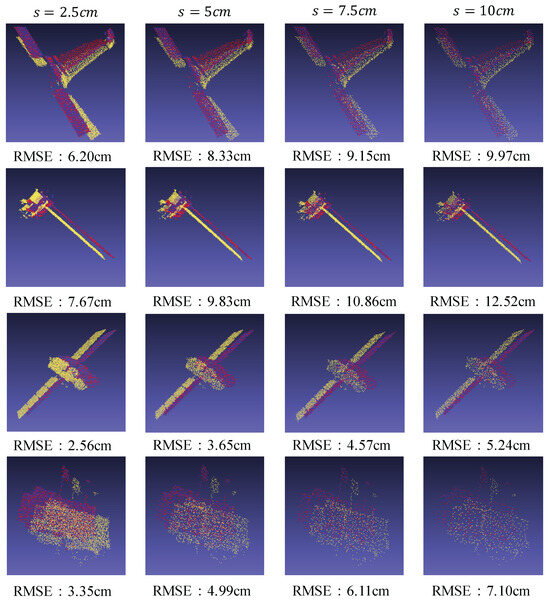 To evaluate our method’s resilience to sensor imperfections, we inject zero-mean Gaussian noise with standard deviations ranging from to 5 cm (relative to original point cloud coordinates) into the test sequences. As shown in Table 2, the proposed method demonstrates remarkable robustness against varying levels of sensor noise, outperforming both traditional and deep learned registration techniques. Across all noise levels ( to 5 cm), our approach achieves the lowest average rotation error (RRE: 2.23°) and translation error (RTE: 9.43 cm), significantly surpassing traditional methods like ICP (RRE: 10.69°, RTE: 40.77 cm) and NDT (RRE: 9.41°, RTE: 38.70 cm). Notably, under severe noise conditions ( = 5 cm), our method maintains superior performance with RRE and RTE values of 3.14° and 12.24 cm, respectively—outperforming even learning-based methods such as RPM-Net (RRE: 6.27°, RTE: 15.61 cm) and IDAM (RRE: 7.23°, RTE: 17.85 cm). The dual-stage architecture, combining coarse feature-based alignment with geometry-aware refinement effectively mitigates noise interference, as evidenced by the minimal error escalation ( RRE: 1.38°, RTE: 4.22 cm), as noise increases from = 1 cm to 5 cm. In contrast, methods like LSG-CPD and RobustICP exhibit sharper error degradation (e.g., LSG-CPD’s RTE rises from 6.31 cm to 18.46 cm). The results highlight the framework’s resilience to noise, attributed to its multi-scale iterative refinement that prioritizes geometric consistency over raw descriptor matching. This capability is critical for real-world spacecraft operations, where sensor measurements are inherently noisy, and precise pose estimation under uncertainty remains paramount.