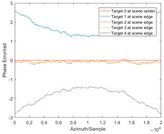 Since the proposed method is a PGA-based error estimation method, the first-order and constant polynomial error will not be estimated, and these errors will lead to constant phase and displacement in the final SAR image. Considering that error estimation and compensation are applied to each block, residual errors after compensation vary among the blocks. The varying residue errors will cause varying displacement and constant phase in each block: