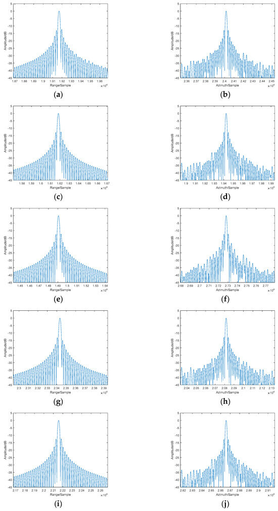 34]: The electromagnetic waves of SAR will travel through the atmosphere twice, and the atmosphere will affect the SAR signal. The atmospheric impact mainly includes three aspects: background ionosphere, ionospheric scintillation, and the tropospheric impact. The background ionosphere mainly brings polynomial phase errors, and it will degrade focusing performance by spreading the mainlobe and introducing asymmetric sidelobes. Ionospheric scintillation will bring random phase and amplitude errors, which will mainly affect focusing performance by degrading the integrated sidelobe ratio (ISLR).