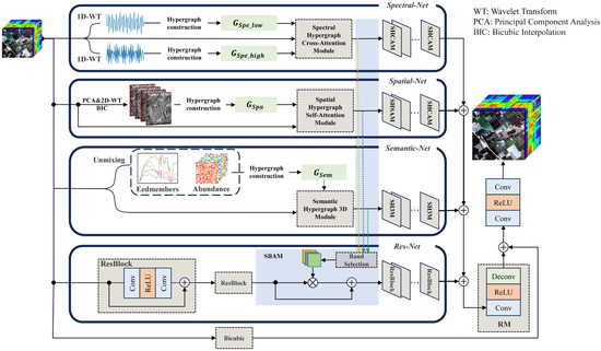 - In order to effectively extract and utilize frequency characteristics, we construct SHCAM and SHSAM based on high- and low-frequency features in spectral and spatial dimensions, respectively. Hypergraph modules with attention mechanisms achieve detailed texture and spectrum reconstruction by capturing the main structure and detail changes within the image;