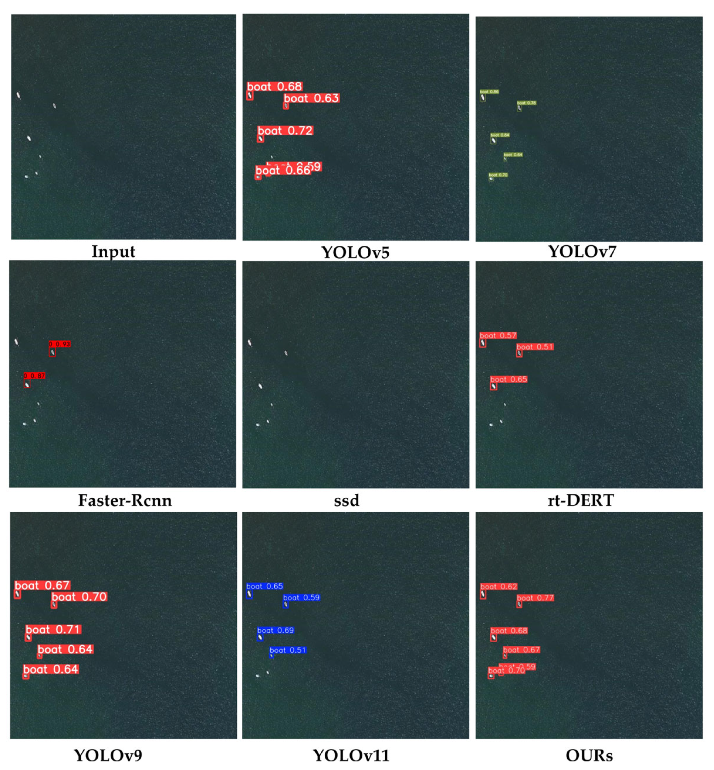 Figure 5b presents the results obtained with C2f_DCNv3. In the shallow layers with higher feature resolution (i.e., the 2nd and 4th layers), the standard convolution heatmaps reveal large blue areas in the background, such as ocean waves. In contrast, the use of C2f_DCNv3 significantly reduces the blue background regions and enhances the contrast between the targets and the background. In the deeper layers with lower resolution (e.g., the 6th layer), standard convolution tends to yield dispersed feature responses, whereas deformable convolution maintains concentrated yellow response regions due to its adaptive receptive field, indicating stronger capability in capturing long-range features of deformable targets. The more concentrated distribution of yellow areas in the deformable convolution heatmaps reflects improved target localization accuracy. Notably, in the complex scenes represented by the 6th layer, the target edges and local features still exhibit high-contrast responses. This characteristic enables the network to maintain robust feature extraction performance even when ship targets undergo deformation or occlusion.