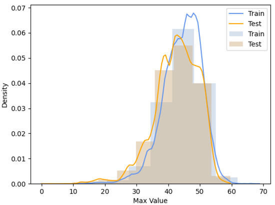 As shown in Figure 2, the distribution of maximum values in the training and test sets is illustrated. The horizontal axis represents the maximum value within a single sample, while the vertical axis represents the data density. The blue curve corresponds to the distribution of the training set, and the orange curve corresponds to the distribution of the test set. From the figure, it can be observed that the maximum values in the training set are primarily concentrated within the range [35, 55], with the majority of samples falling within [40, 50]. The distribution of maximum values in the test set is consistent with that of the training set, indicating a similar statistical pattern between the two sets.