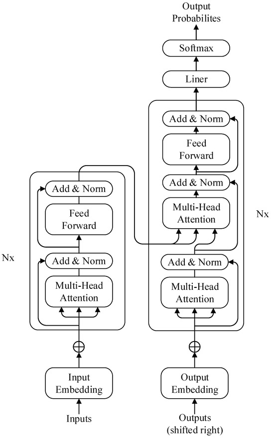 - Vaswani, A.; Shazeer, N.; Parmar, N.; Uszkoreit, J.; Jones, L.; Gomez, A.N.; Kaiser, Ł.; Polosukhin, I. Attention is all you need. Advances in Neural Information Processing Systems. arXiv 2017, arXiv:1706.03762. [Google Scholar]
