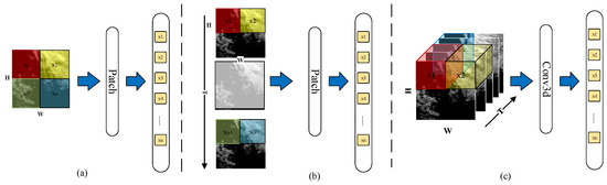 (a) Two-dimensional patch coding in ViT [28], (b) Two-dimensional patch coding directly introduced into the video sequence, (c) patch coding based on 3D convolution.