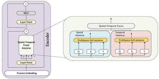 As shown in Figure 6, we use different attention heads to calculate temporal and spatial attention separately [29]. Initially, the spatial and temporal dimensions are combined as . In this paper, the corresponding temporal , () as well as spatial , () are constructed. For half of the attention heads, spatial attention is computed as , while for the other half, temporal attention is computed as . The attention heads are then merged through a linear layer, assigning attention weights to each patch in both spatial and temporal dimensions. The calculation is as follows: