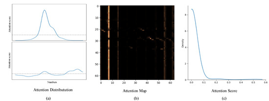 (a) Two distribution plots of self-attention, (b) visualization of attention in the actual model, (c) density comparison of attention scores in the actual model.