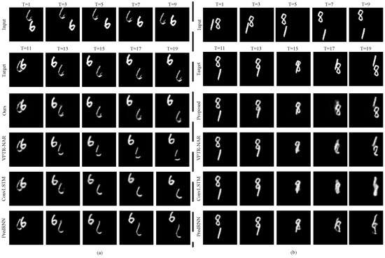 Comparison of prediction results of various models on the Moving MNIST dataset. (a,b) are two different samples, from top to bottom are input, target and results of different models: ViViT-Prob, VPTR-NAR, ConvLSTM, and PredRNN.