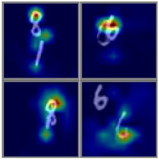 Figure 11 illustrates the visualization effect using class activation mapping (CAM) [42] during the decoding process. CAM represents a weighted linear sum of visual patterns at different spatial locations, and by simply upsampling the class activation map to the size of the given image, it highlights the most relevant regions of the image. As shown in the Figure 11, the model assigns higher attention to the areas where digits appear, including the edges of the digits and the overlapping regions between two digits. This focused attention results in clear edges, small overall errors, and high image similarity in the predicted images.