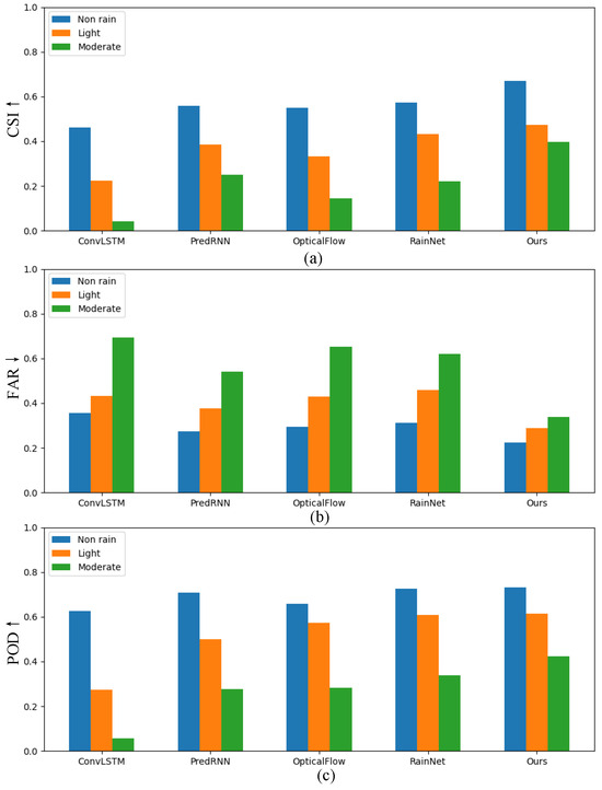 Figure 12 presents a comparative analysis of the inversion results across different precipitation intensity levels, where higher CSI and POD scores coupled with lower FAR values indicate better performance. Most models perform well for no-rain conditions, but their effectiveness diminishes significantly with increasing precipitation intensity, particularly for ConvLSTM and OpticalFlow. RainNet and PredRNN achieve suboptimal CSI and POD scores across multiple intensity levels; however, RainNet exhibits a higher FAR, indicating more frequent false alarms. In contrast, while PredRNN shows moderate performance for light rain and below, it achieves competitive FAR and CSI scores for moderate rain, suggesting that its predictions for mid-level precipitation exhibit smaller echo value errors and more accurate spatial coverage. Comparatively, the proposed model consistently outperforms other models across multiple metrics in all three precipitation levels. However, due to the predominance of no-rain grid points in the dataset, some underestimation of precipitation intensity persists. These experimental results demonstrate that the proposed model generates reasonable echo predictions, providing reliable auxiliary reference for precipitation forecasting and effectively reflecting expected rainfall intensity within two hours.
