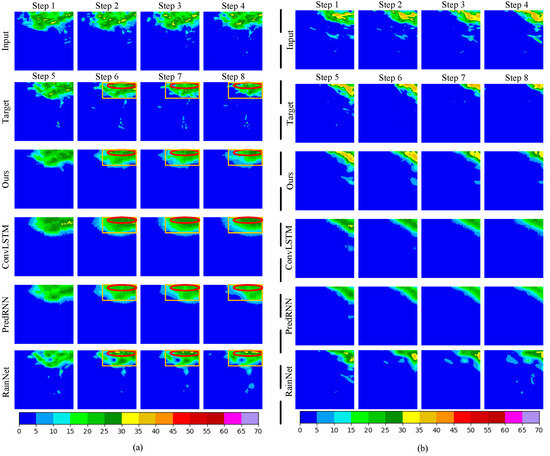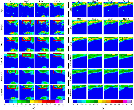 Figure 13a illustrates the gradual movement of a large area of low-intensity radar echoes toward the upper right. We use red circles and orange boxes to mark the range of echo above 25 dBZ and overall echo. Initially, the ConvLSTM successfully predicted the presence of echoes exceeding 30 dBZ, albeit with positional deviations, and failed to capture the movement direction of the echoes over time. The ConvLSTM displayed echoes above 25 dBZ within the red circles, whereas the target mostly showed 20–25 dBZ echoes with only a few areas exceeding 25 dBZ. In contrast, PredRNN provided more accurate predictions for the movement trends of echoes above 25 dBZ, though the contours of echoes exceeding 5 dBZ in the final frame appeared blurred and spatially overestimated. RainNet produced smoother overall echo boundaries but exhibited a tendency to overestimate echo intensities. Although RainNet showed yellow echoes within the red circles, the corresponding positions in the target exhibit almost no yellow echoes, except for sporadic yellow echoes in the last frame where the echo coverage is significantly smaller than predictions. Additionally, RainNet exhibited a noticeable void in the lower-left corner of the orange bounding box. In the last column of images, the left side of the orange box shows echo intensities above 25 dBZ, while the corresponding target area registers below 5 dBZ. ConvLSTM predicted larger areas but with more diffuse and coarser edges. The proposed model initially correctly predicted the positions of three 25 dBZ echo regions and broadly simulated their movement direction over time. In the final frame, the contours of echoes above 10 dBZ closely matched the actual observations, though some scattered echoes were missed, and low-intensity echo coverage was overestimated.