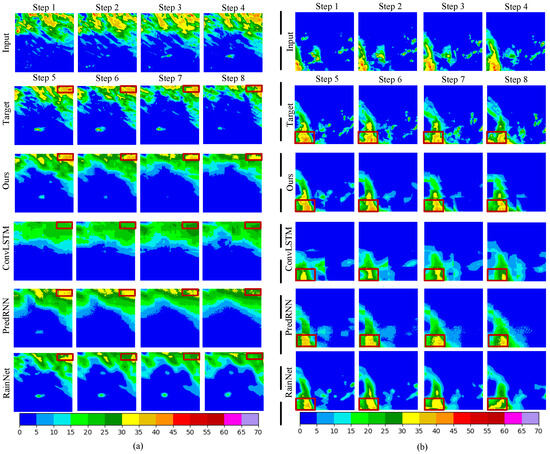 Comparison of prediction results of various models on the radar echo dataset. (a,b) are two different samples, from top to bottom are input, target and results of different models: ViViT-Prob, ConvLSTM, PredRNN, and RainNet.