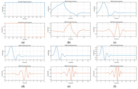 Scaling functions and wavelet functions of (a) Haar, (b) db2, (c) db4, (d) db6, (e) db8, and (f) db10.