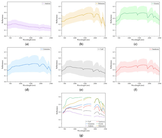 (a–f) Average rock spectra measured using the ASD spectrometer (shaded regions around the curves represent the standard deviation across samples); (g) spectral curves of rocks convolved to the GF-5 AHSI sensor.