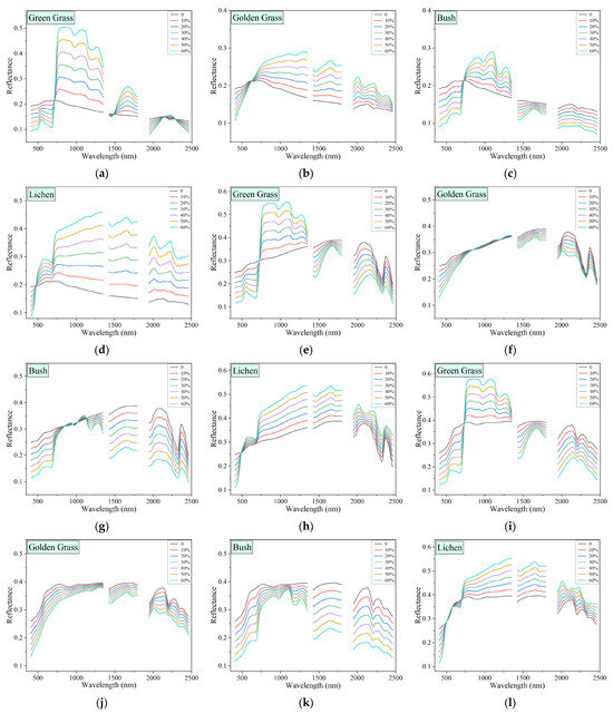 Vegetation and rock spectra were combined to simulate vegetation–rock mixed spectra. To evaluate the impact of vegetation on lithological classification using hyperspectral data, vegetation types were chosen as green grass, golden grass, bushes, and lichens, which are widely found in the study area. Vegetation spectra were obtained from the United States Geological Survey (USGS) spectral library version 7 [35] (Table 2). All spectra were measured using the Analytical Spectral Device (ASD) Full Range standard resolution spectrometer or convolved to ASD Full Range standard resolution. The green grass is probably Kentucky bluegrass, picked from the lawn. The golden grass is described as a dry, non-photosynthetic grass that is golden yellow in color. Lichens were measured on the surfaces of weathered iron-bearing rocks with small, tightly packed yellow-green thalli. Bush measurements were taken vertically with the field of view area consisting of 40% green leaves, 10% red leaves, 20% dark red stems, and 30% litter below the shrub.