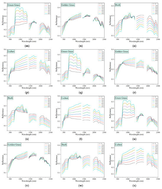 Simulated mixed spectra of different rocks with varying vegetation contents: (a–d) andesite, (e–h) dolomite, (i–l) granite, (m–p) limestone, (q–t) tuff, and (u–x) sandstone.