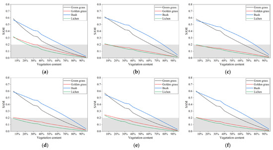 Figure 10 shows the SAM between the mixed spectra containing different contents of vegetation and the vegetation spectra. In general, the SAM decreases as the vegetation content increases. When the green grass content was above or close to 60%, the value of the SAM was lower than 0.2. The smaller SAM between the mixed spectrum containing golden grass and lichen and the vegetation spectrum indicates that the similarity between the mixed spectrum and the vegetation spectrum is high.