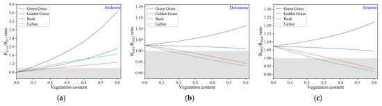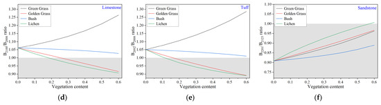 Figure 11 illustrates the impact of different vegetation cover levels on the reflectance ratio of rocks. The reflectance ratio directly reflects the presence of spectral absorption features or reflectance peaks. When the ratio approaches 1, it indicates that the corresponding absorption or reflection feature is nearly eliminated. When the ratio crosses 1, it suggests that the original spectral feature of the rock has disappeared, reducing the distinctiveness of the rock type. Taking dolomite as an example, the B2083nm/B2032nm reflectance ratio decreases with the increasing coverage of lichen, golden grass, and bushes but increases with increasing green grass coverage. As part of the reflectance peak near 2.09 μm, the B2083nm/B2032nm ratio is greater than 1; however, when the coverage of golden grass or lichen exceeds 20%, the ratio drops below 1. This change indicates that the corresponding spectral feature is masked, thereby weakening the recognizable features of the rock.