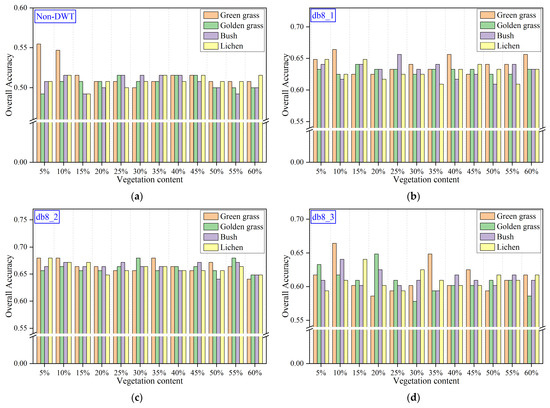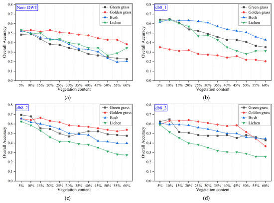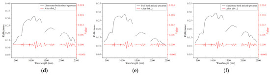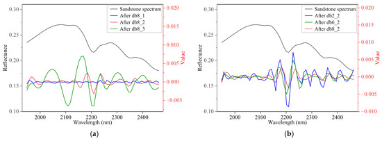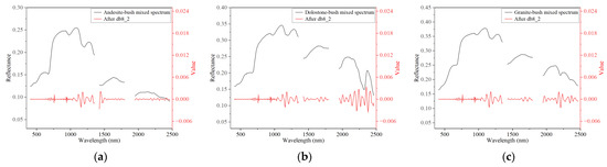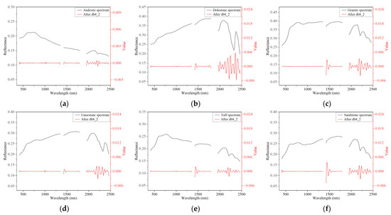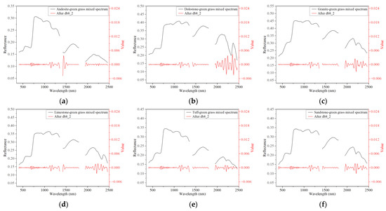 How to effectively enhance the key information of rocks in the vegetation–rock mixing spectrum is crucial to improving the accuracy of rock classification. The high-frequency components of a spectrum reflect the rapid changes in reflectance with wavelength. High-frequency features at different decomposition levels can capture the changes in different scales in the spectral curve [44].