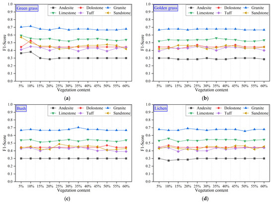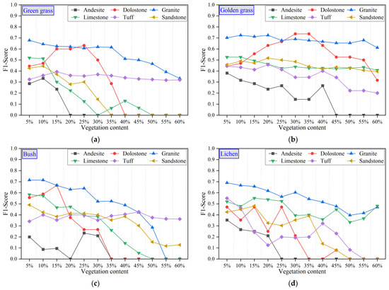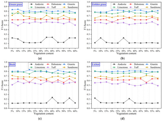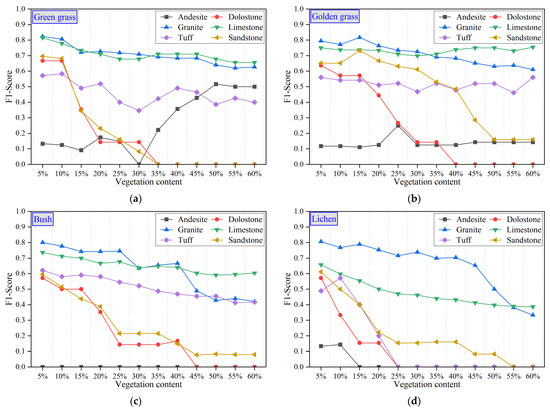 Andesite exhibits a relatively flat reflectance curve without distinctive absorption or reflection peaks, and even a 10% vegetation fraction can cause the mixed spectrum to show similar features to the vegetation spectrum. The 2.31 μm absorption feature of dolomite is less affected by vegetation, while its relatively smooth spectral curve between 0.50 and 1.8 μm begins to show multiple reflection peaks under the influence of green grass and bushes. The granite spectrum is most affected by lichen; when the lichen coverage exceeds 30%, the reflection peak at 2.13 μm disappears, which consequently weakens the absorption feature at 2.20 μm. The 2.32 μm absorption feature of limestone is stable under vegetation influence. In the 0.41–1.8 μm range, limestone reflectance is sensitive to green grass, and between 0.76 and 1.35 μm, it is sensitive to bushes. The reflection peak at 2.10 μm for limestone disappears when golden grass coverage exceeds 20%. The absorption depth at 2.21 μm for tuff gradually decreases as the vegetation content increases and disappears when lichen coverage exceeds 40%. In the 0.41–1.35 μm range, the slope of the sandstone spectrum is significantly influenced by green grass and bushes. The depth of the absorption feature near 2.21 μm also decreases with increasing vegetation and disappears when lichen exceeds 50%.