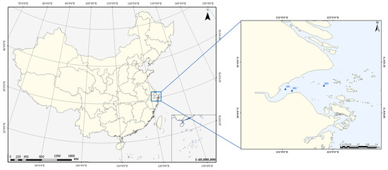 Hangzhou Bay is located in the northern Zhejiang Province and southern Shanghai (29.92°–30.86°N, 120.95°–122.07°E), China. As the estuary of the Qiantang River and a globally renowned strongly tidal estuarine bay, approximately 435 million tons of sediment (recorded at Datong Station during 1951–2000) is discharged annually from the Yangtze River mouth estuary into the East China Sea, with about 230 million tons transported southward into Hangzhou Bay, thereby constituting the primary sediment source for the bay (Wu et al., 2006) [27]. In this region, the inflow from the upper Qiantang River basin is about one-hundredth of the water coming in with the rising tide from the East China Sea; consequently, the influence of river discharge is minimal, and tidal dynamics predominantly govern the system. Pronounced diurnal variations in tidal current speed and direction, driven by strong tidal currents and circulations, maintain persistently high SSC in Hangzhou Bay.