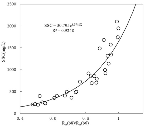 Regression relationship between measured suspended sediment concentration (SSC) and measured GOCI Rrs(b8)/Rrs(b6) at modeling points in Hangzhou Bay.
