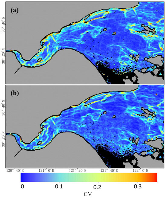 Coefficient of variation of suspended sediment concentration in a 3 × 3 window on 12 December 2011: (a) HJ CCD image at 10:39 (500 m); (b) GOCI image at 10:29 (500 m).