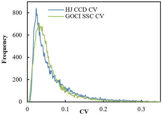 Frequency distribution of the coefficient of variation in a 3 × 3 window for GOCI and HJ CCD retrieval results.