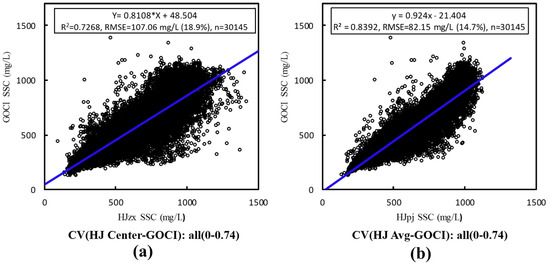 Regression relationships between two different scales of HJ CCD SSC and corresponding GOCI SSC: (a) the regression between HJ-Center SSC and GOCI SSC; (b) the regression between HJ-Avg SSC and GOCI SSC.