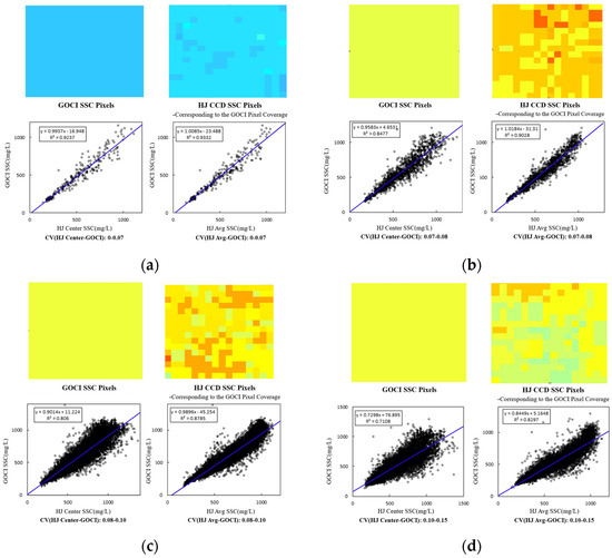 To further investigate the scale effects under varying degrees of spatial heterogeneity, the CV values were divided into eight intervals: 0–0.07, 0.07–0.08, 0.08–0.10, 0.10–0.15, 0.15–0.20, 0.20–0.25, 0.25–0.30, and 0.30–0.74. Figure 11 displays sample SSC pixels and the regression relationships between the two resampled HJ CCD SSC and GOCI SSC for each interval. It is evident that as the CV increases, the internal variability of HJ CCD SSC becomes more pronounced, and the correlation between the HJ CCD and GOCI SSC decreases progressively.