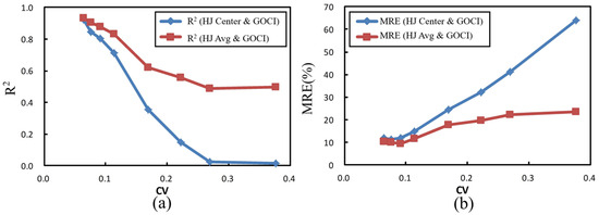 Table 6 details the R2 and MRE values for the regression relationships corresponding to each CV interval, and Figure 12 illustrates the trend of R2 and MRE as the CV increases. Notably, when CV > 0.10, the correlation between the central pixel SSC of the HJ CCD and the GOCI retrieval drops markedly, and the MRE increases significantly; in contrast, the regression using the mean SSC shows a smaller deterioration in terms of both correlation and error. Therefore, in this study, for the HJ CCD SSC and GOCI SSC data, when the CV of SSC within the HJ CCD 17 × 17 window corresponding to a GOCI pixel exceeds 0.1, scale effects become significant. In such regions, directly validating GOCI SSC retrievals with in situ measurements may introduce considerable uncertainty into the evaluation results.