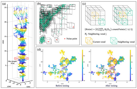 Schematic of the layered adaptive voxel denoising method. (a) The point cloud of single trees is stratified with a layer thickness of 0.5 m (adjacent layers are represented by different colors), and the red box encloses a point cloud slice of 5.5–6 m. (b) A local magnified view of the voxels and denoising results from the slice at 5.5–6 m, where red indicates noise points, green indicates non-noise, and the black wireframe indicates voxels. (c) The principle of voxel denoising is that if the total number of points in the 26 neighboring voxels of a current non-empty voxel is less than or equal to 1, the points in the current voxel are considered to be noise. (d) A top-down comparison view of the slice at 5.5–6 m before and after denoising, where the red points represent noise.