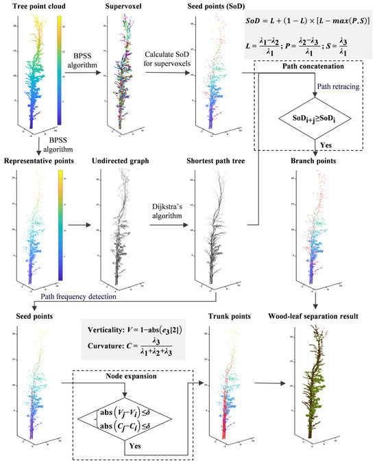 Tree structure, such as the form of the trunk, the arrangement of branches, and the shape, size, direction, and spatial distribution of leaves, directly affect photosynthesis and transpiration. This, in turn, influences the relative competitive advantage of trees and their growth, ultimately impacting the carbon cycle, water cycle, nutrient cycle, and biodiversity of forests [1,2,3]. Understanding the relationship between tree structure and tree physiological functions requires quantifying the differences in tree components. However, the precise extraction of tree components through manual measurement is challenging and limited in scale, precision, and cost–benefit ratio [4,5]. Terrestrial laser scanning (TLS) has introduced a revolutionary method capable of rapidly and automatically capturing three-dimensional point clouds with millimeter-level detail, thereby obtaining a comprehensive representation of tree structures and providing opportunities for quantitative analysis of tree structure characteristics [6,7]. Therefore, TLS is now extensively employed for deriving forest structure parameters [8,9,10], biomass assessment [11,12,13], and canopy gap fraction and leaf area estimation [14,15,16]. For most TLS-based forest applications, wood–leaf separation is a prerequisite. For example, when estimating the leaf area, woody components must be removed, as their presence can lead to overestimations of the leaf area index by 3–32% [17,18,19]. Conversely, when quantifying wood volume or aboveground biomass (AGB), the inclusion of leaf points can similarly result in overestimated results [20,21,22]. Therefore, the precise quantification of tree structures is urgently needed in applications such as forest resource inventory, forest management, and yield estimation [23,24]. Although the importance of separating wood and leaf components from point cloud data is increasingly recognized, achieving automated, precise, and efficient extraction of tree trunks and leaf points in complex forest stands remains a challenging task. Many scholars have proposed a variety of methods for separating tree branches and leaves in point clouds. These methods can be broadly classified into four categories: geometry feature-based methods, radiometry feature-based methods, graph-based methods, and deep learning-based methods.